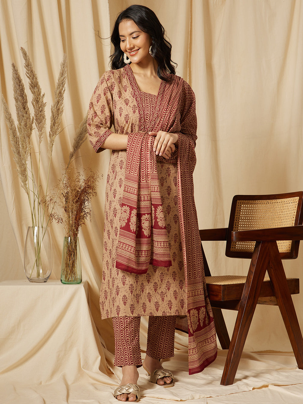 Beige And Maroon Ethnic Motifs Printed Cotton Suit Set