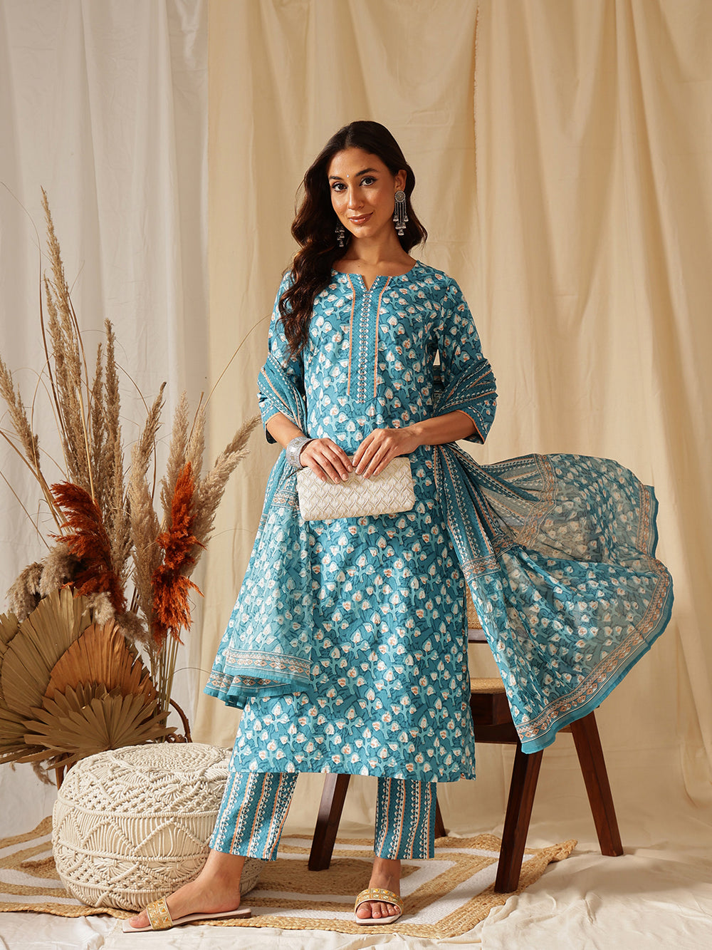 This kurta set is a vibrant and stylish choice for any occasion. The blue and white color scheme creates a refreshing and elegant contrast, while the ethnic patterns add charm and detail. The kurta has a V-neckline with border details, and three-quarter sleeves that provide comfort and coverage.