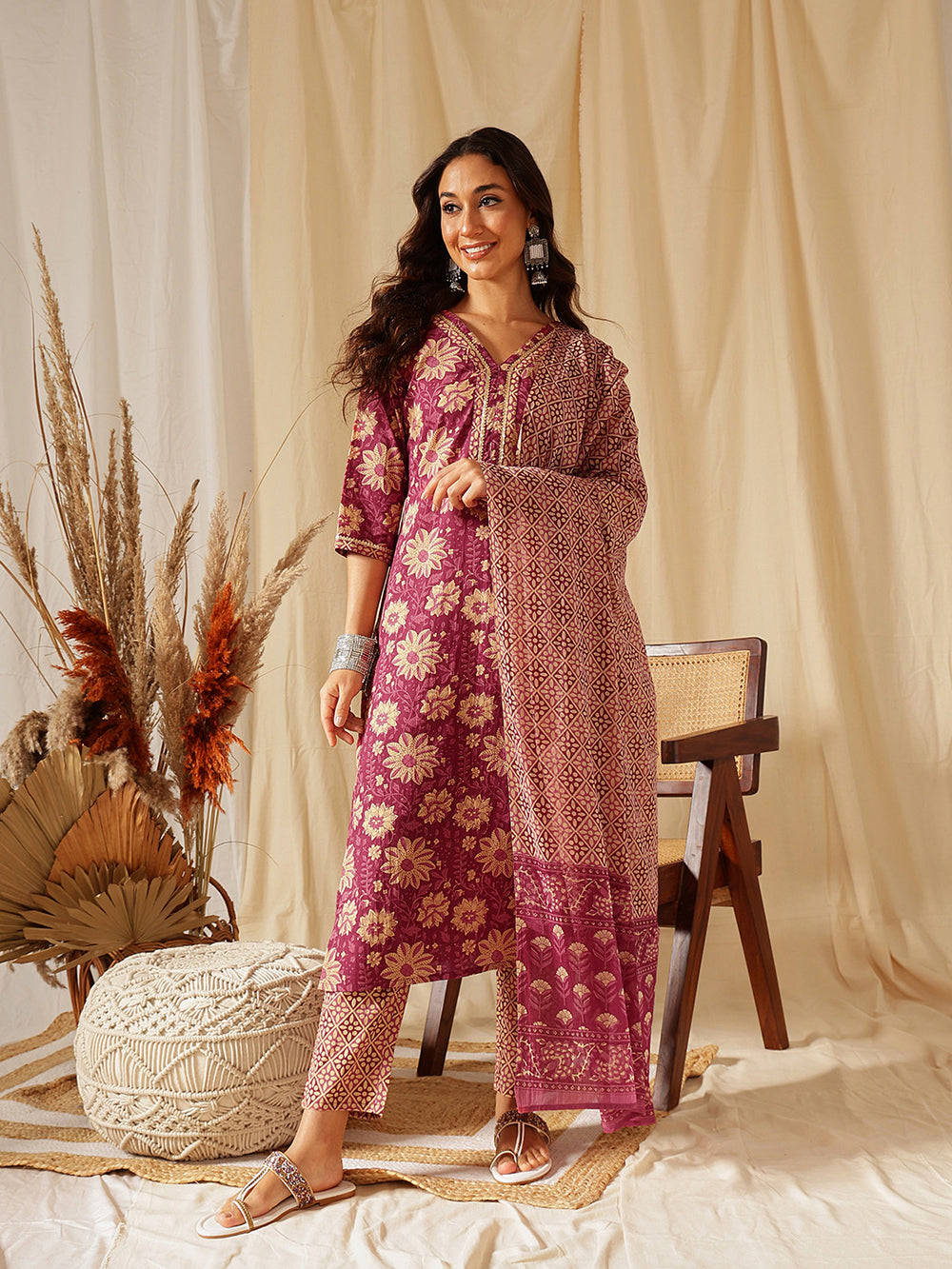 The set is completed with a Dupatta made from burgundy cotton material with ethnic prints. The Dupatta is accentuated with ethnic motif borders at the ends, adding an elegant touch to the outfit.