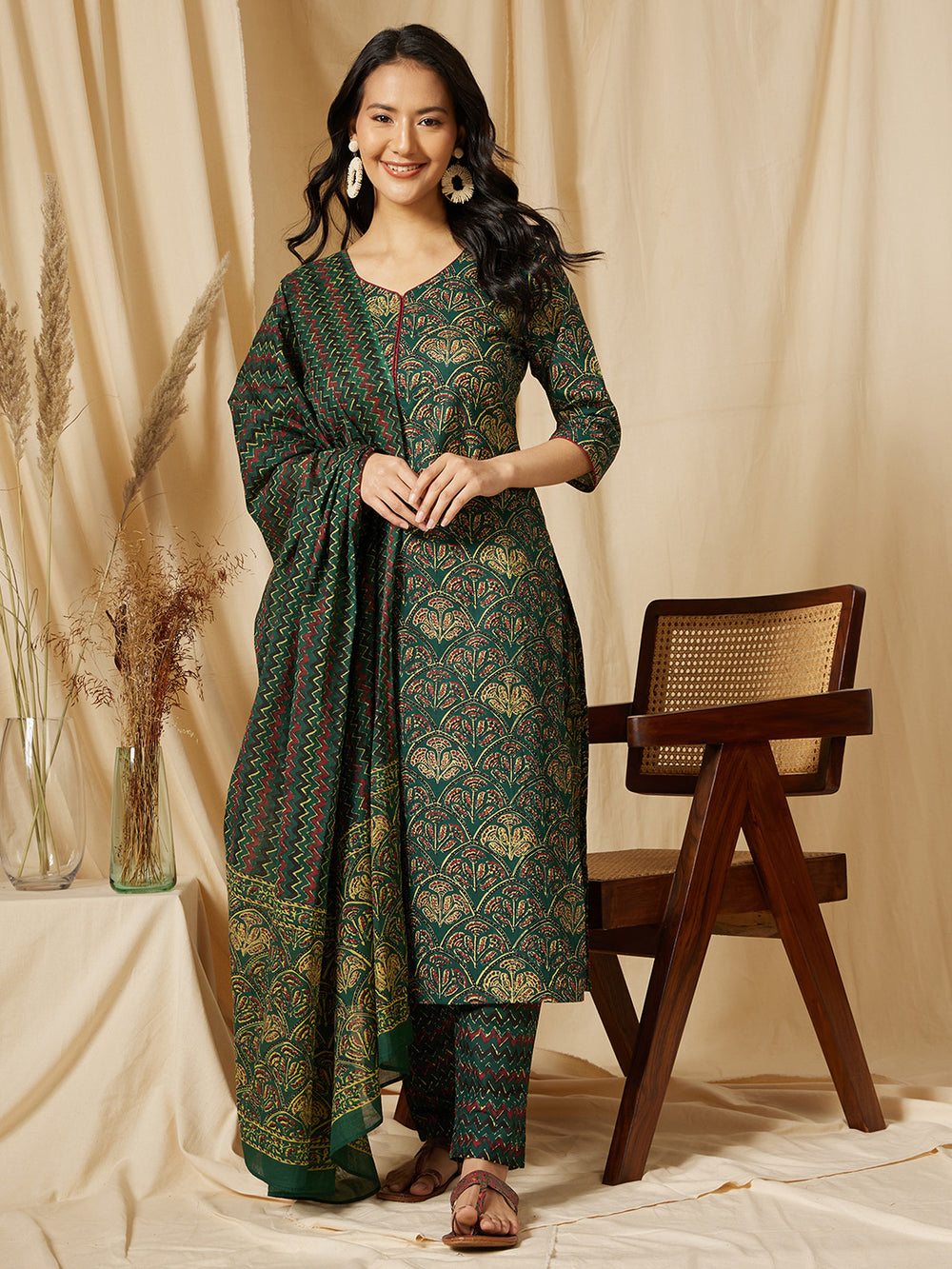 The set is completed with a Dupatta, made from the same green cotton material and floral prints. The Dupatta is accentuated with ethnic motif borders at the ends, adding an elegant touch to the outfit.