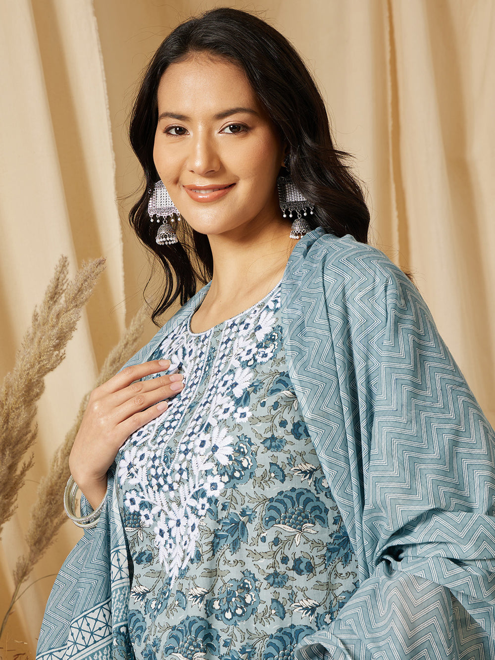 This kurta set is a stunning example of traditional Indian attire with a modern twist. The kurta features a beautiful floral pattern in shades of blue, creating a soothing and elegant effect. The white embroidery around the neckline adds contrast and detail, while the three quarter sleeves provide comfort and coverage.