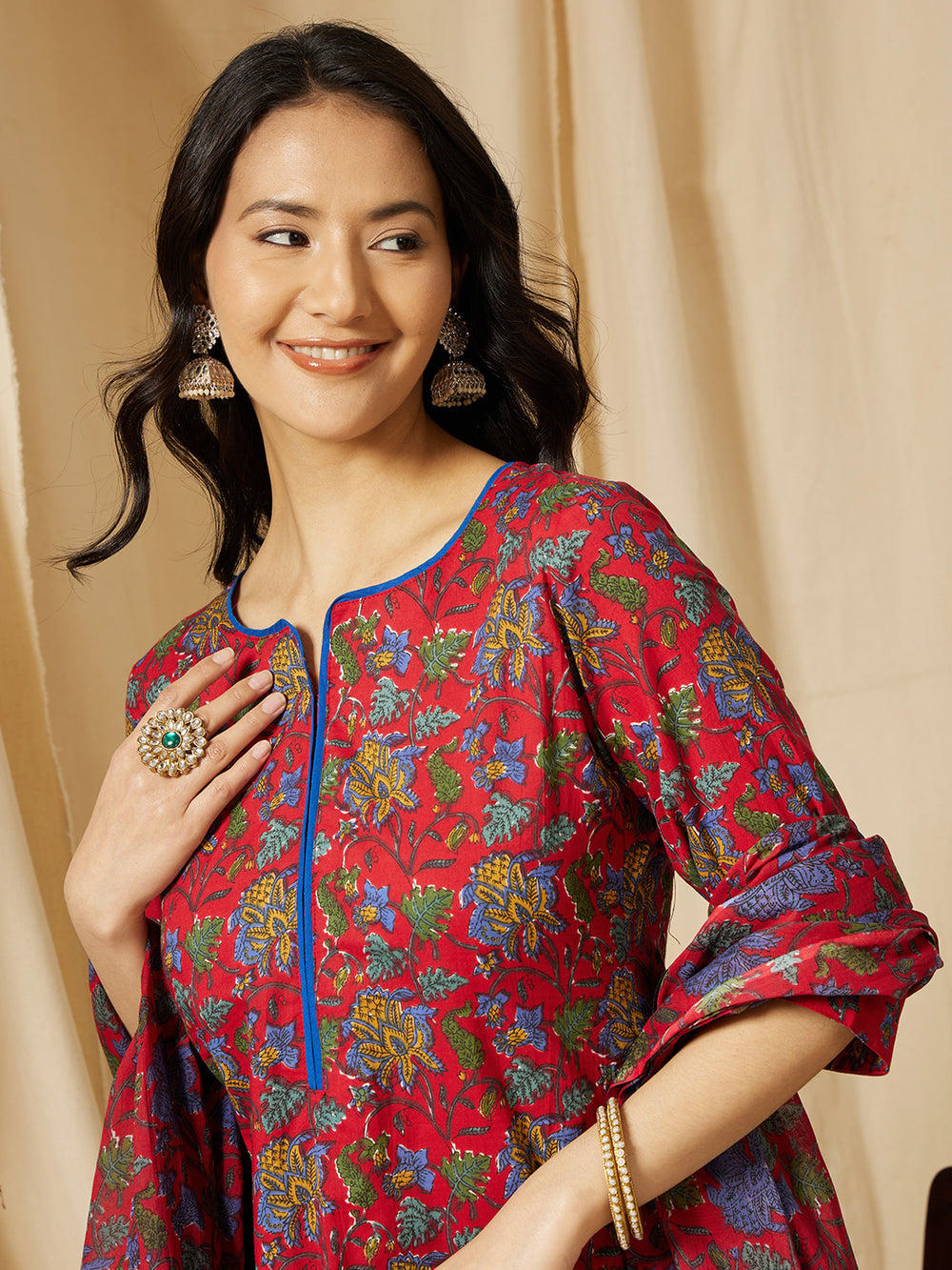 Look stunning and stylish in this beautiful kurta set, a perfect choice for any occasion. This kurta set features a red kurta with a floral print and contrast piping on placket. The kurta has three-quarter sleeves and a straight fit that flatters your figure.