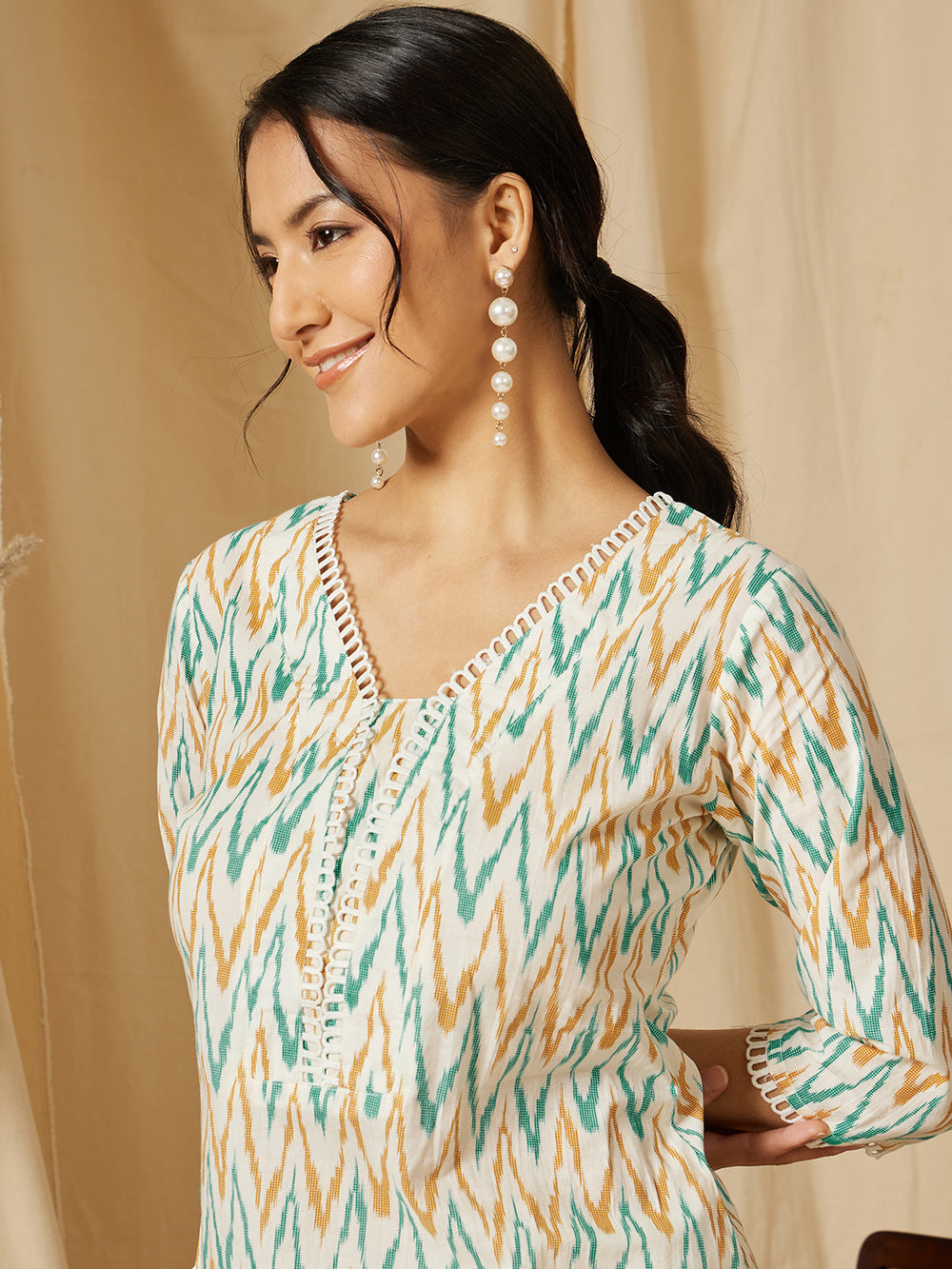 The model is wearing a vibrant co-ord set that stands out with its unique zigzag pattern. The pattern features a mix of colors, including blue, yellow, and white, adding a playful touch to the outfit. The tunic has a relaxed fit with three-quarter sleeves and extends to the mid-thigh, providing a casual yet stylish look.