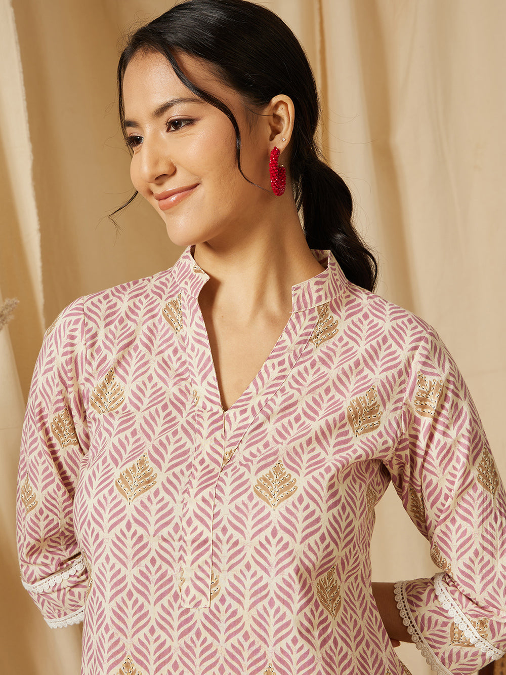 The model is wearing a Co-ord set that consists of a tunic and matching palazzos. The outfit is adorned with a ethnic pattern interspersed with floral motifs, rendered in contrasting colors to the light base color of the fabric. The tunic has 3/4th sleeves and a relaxed fit, while the pants are straight-cut, providing a comfortable yet stylish look.