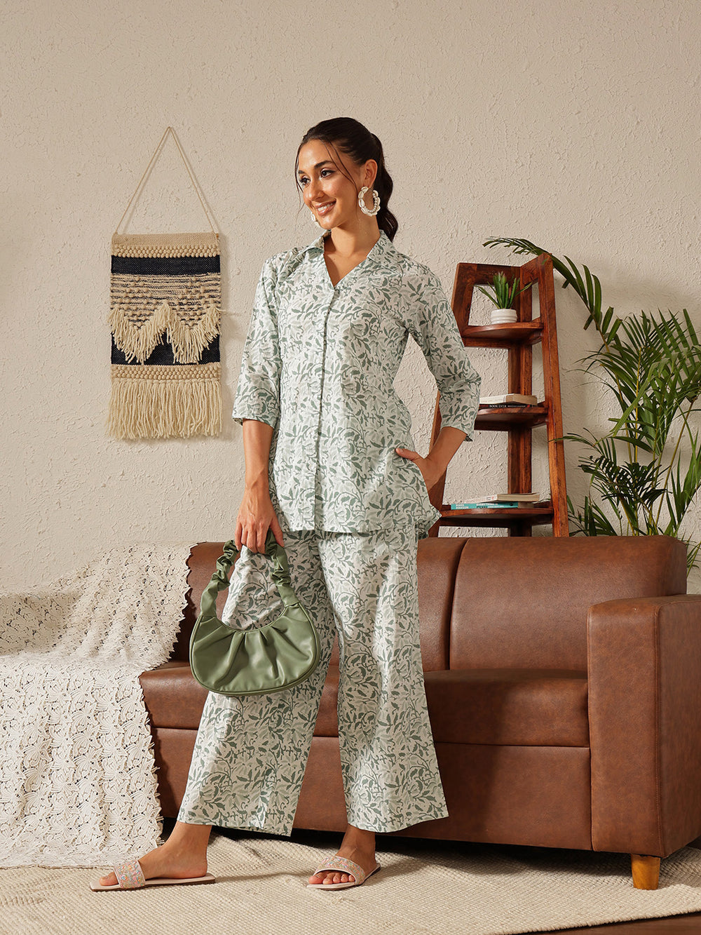 The model is wearing a co-ord set that features a vibrant and artistic pattern of leaves in various shades of green. The top is a button-down shirt with a collar, and it has three-quarter sleeves.