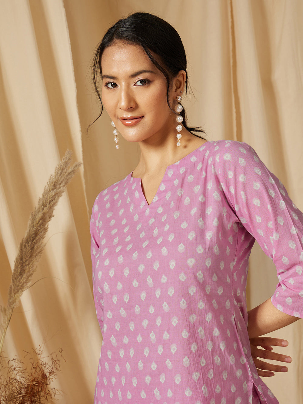 This Co-ord set consists of a top and bottom. The top is a tunic style with three-quarter sleeves, featuring a V-neckline. It is lilac in color with white ethnic motifs throughout. The palazzos are wide-legged and have the same lilac and ethnic motifs pattern, creating a cohesive look.