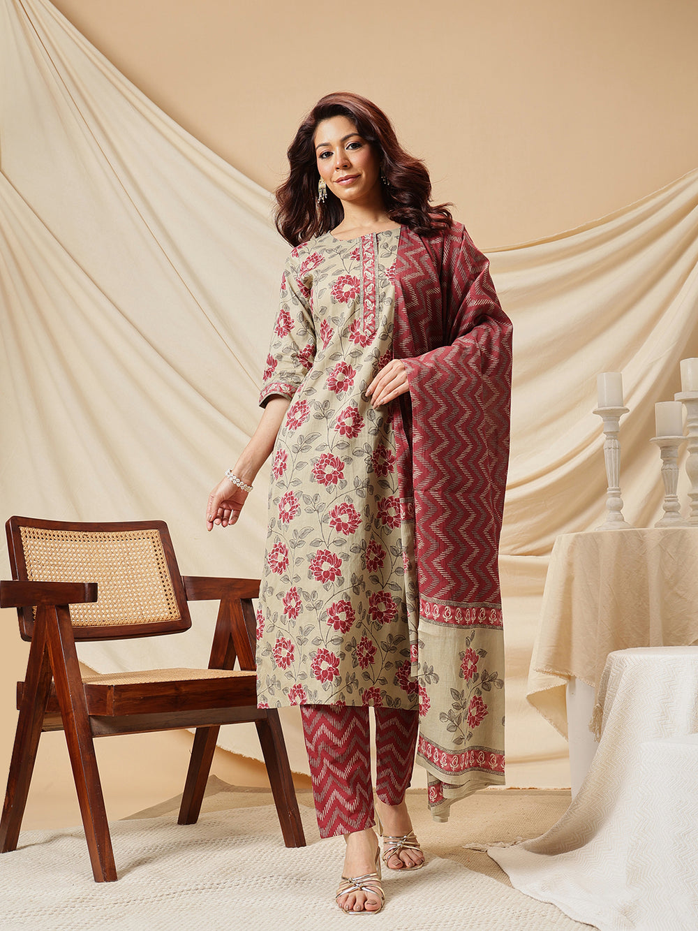 The set is completed with a Dupatta made from purple cotton material with floral prints. The Dupatta is accentuated with ethnic motif borders at the ends, adding an elegant touch to the outfit.