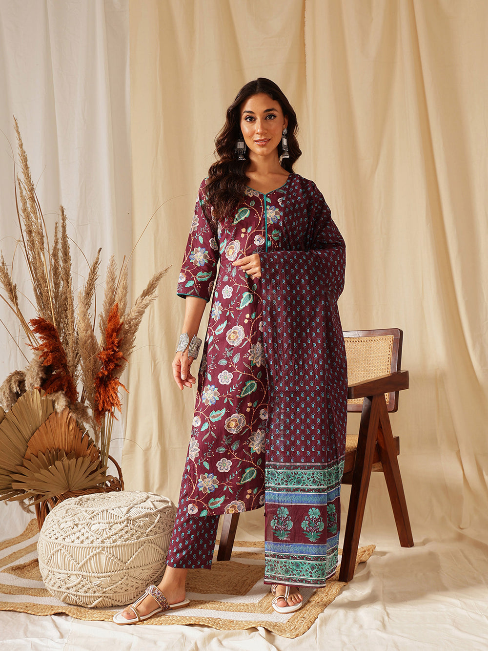 This kurta set is a stylish and sophisticated choice for any occasion. The maroon and green color scheme creates a warm and elegant contrast, while the floral patterns add charm and detail. The kurta has a v neckline with contrast piping on the front, and three-quarter sleeves that provide comfort and coverage.