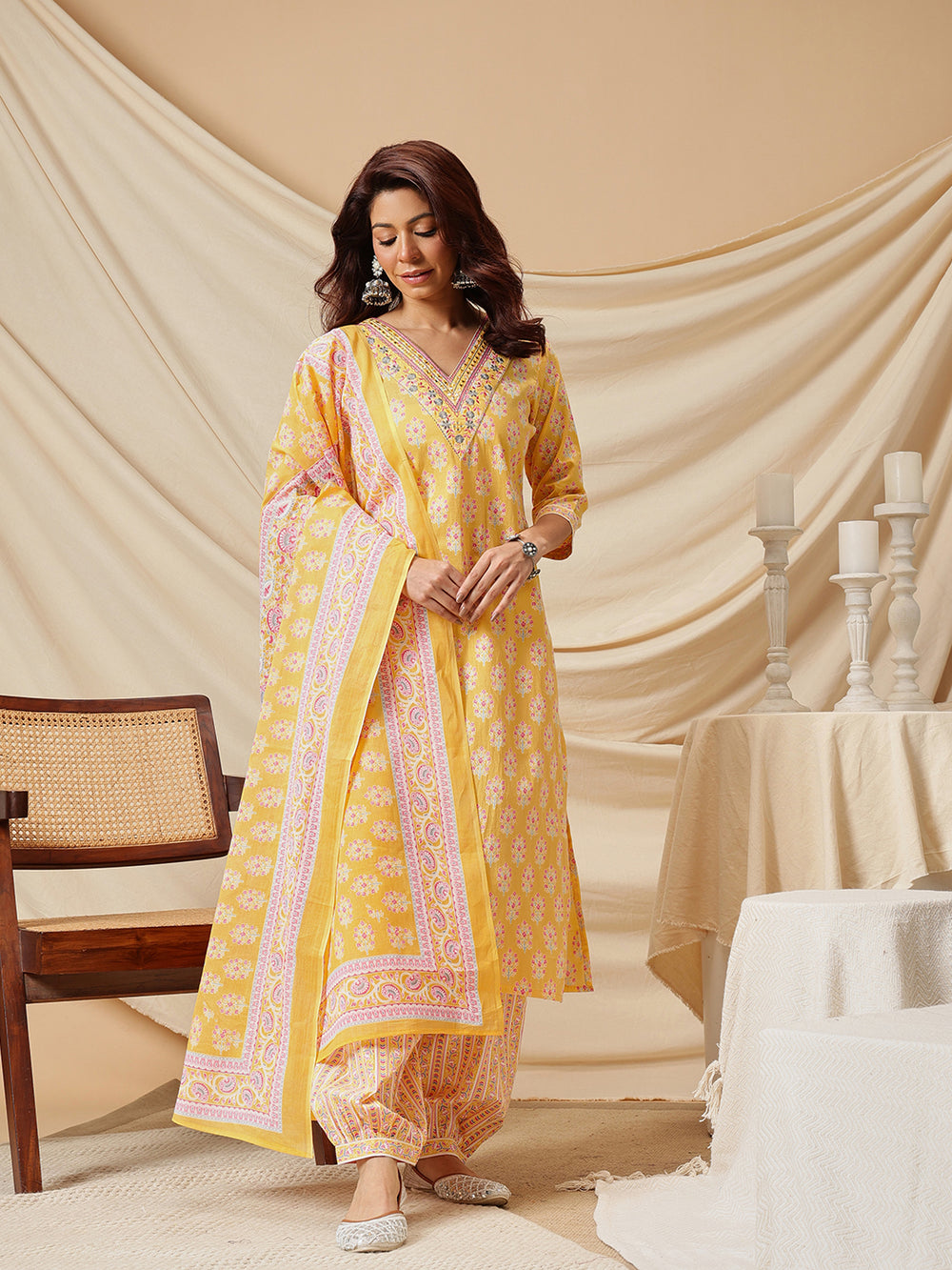 Yellow Embroidered Floral Printed Cotton Suit Set