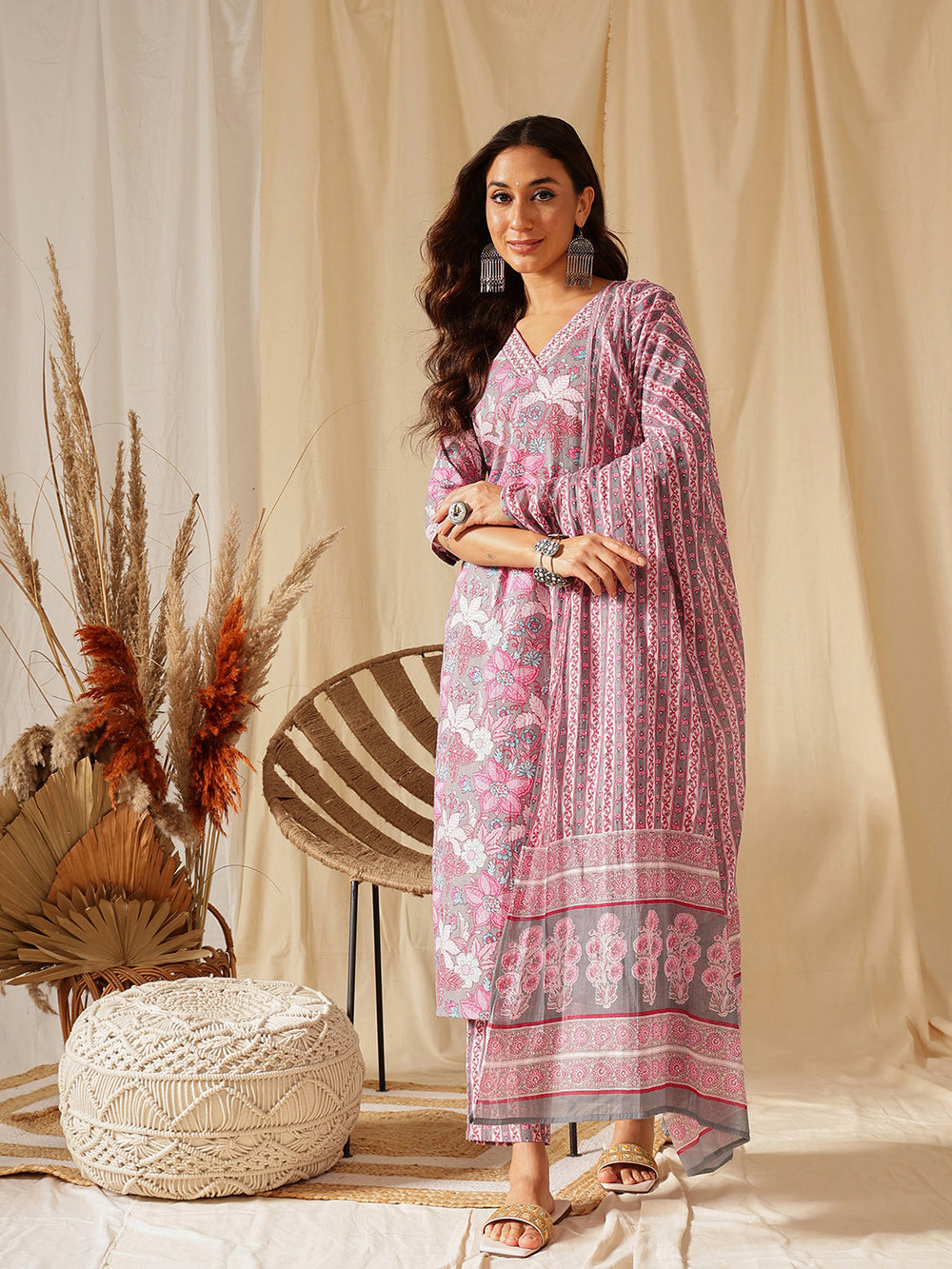 The ensemble is completed with a Dupatta that matches the Kurta and Trousers. It carries the same floral print and adds an extra layer of elegance to the outfit.