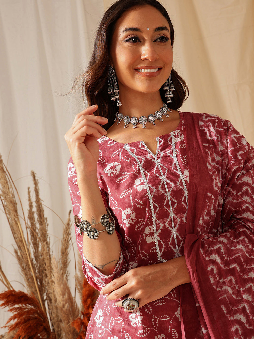 The Kurta is made from comfortable maroon cotton material adorned with all-over ethnic prints. It features a stylish border with lace on the front, adding a touch of sophistication to the ensemble. The Kurta has three-quarter sleeves and side slits, providing a blend of traditional design and modern comfort.