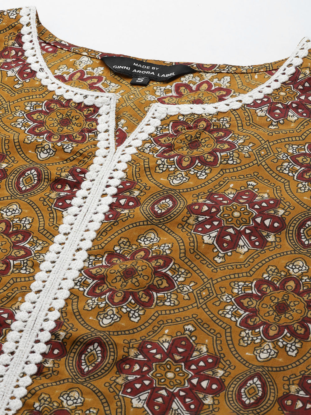 This three-piece set includes a kurta with trousers and dupatta. The mustard cotton kurta features all-over ethnic prints, with lace detailing on the front, three-quarter sleeves, and side slits.