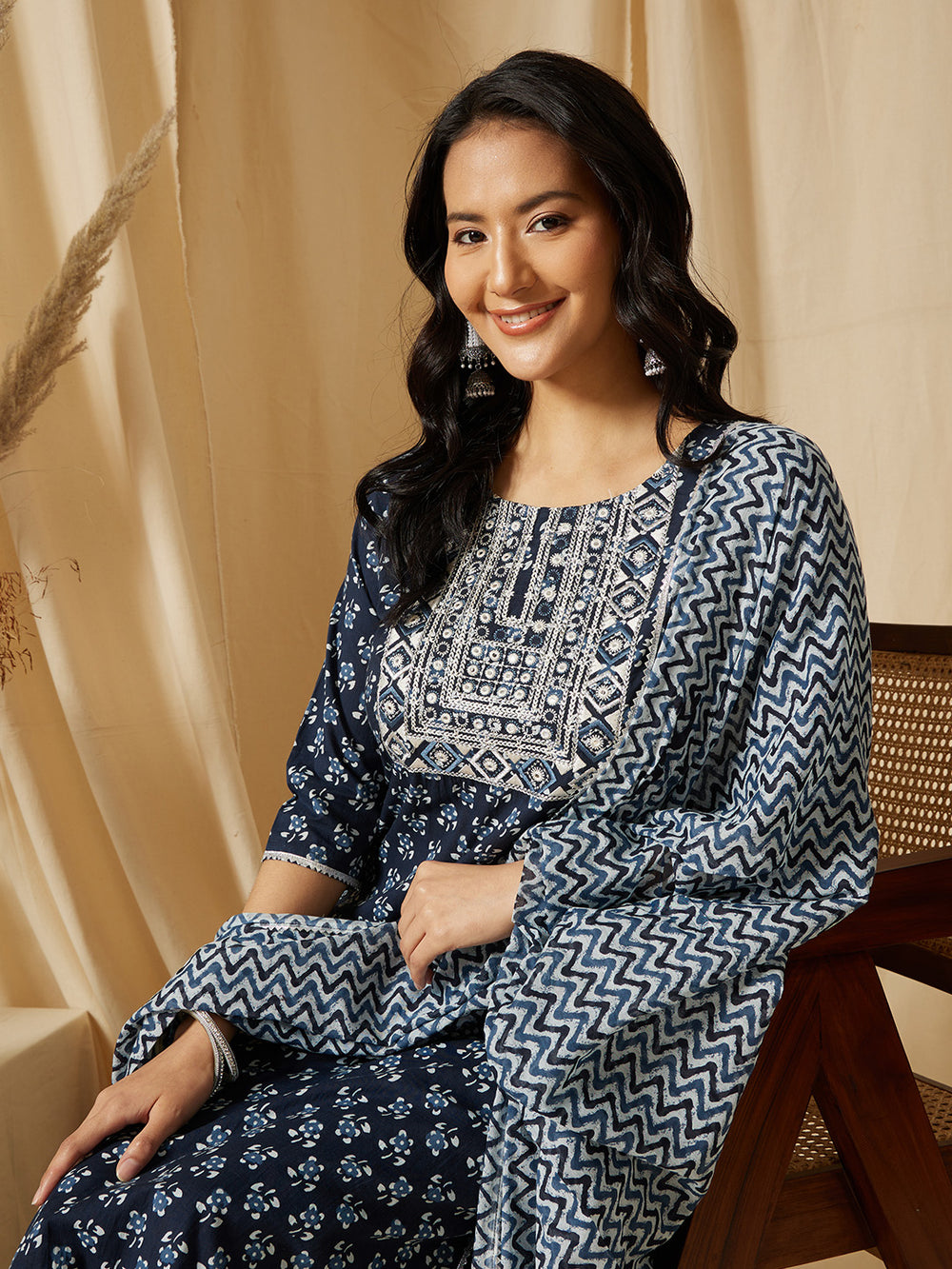 This kurta set is a stylish and sophisticated choice for any occasion. The navy blue and white color scheme creates a striking contrast, while the intricate patterns add elegance and detail. The kurta has a round neckline with white embroidery, and three quater sleeves that match the body of the garment.