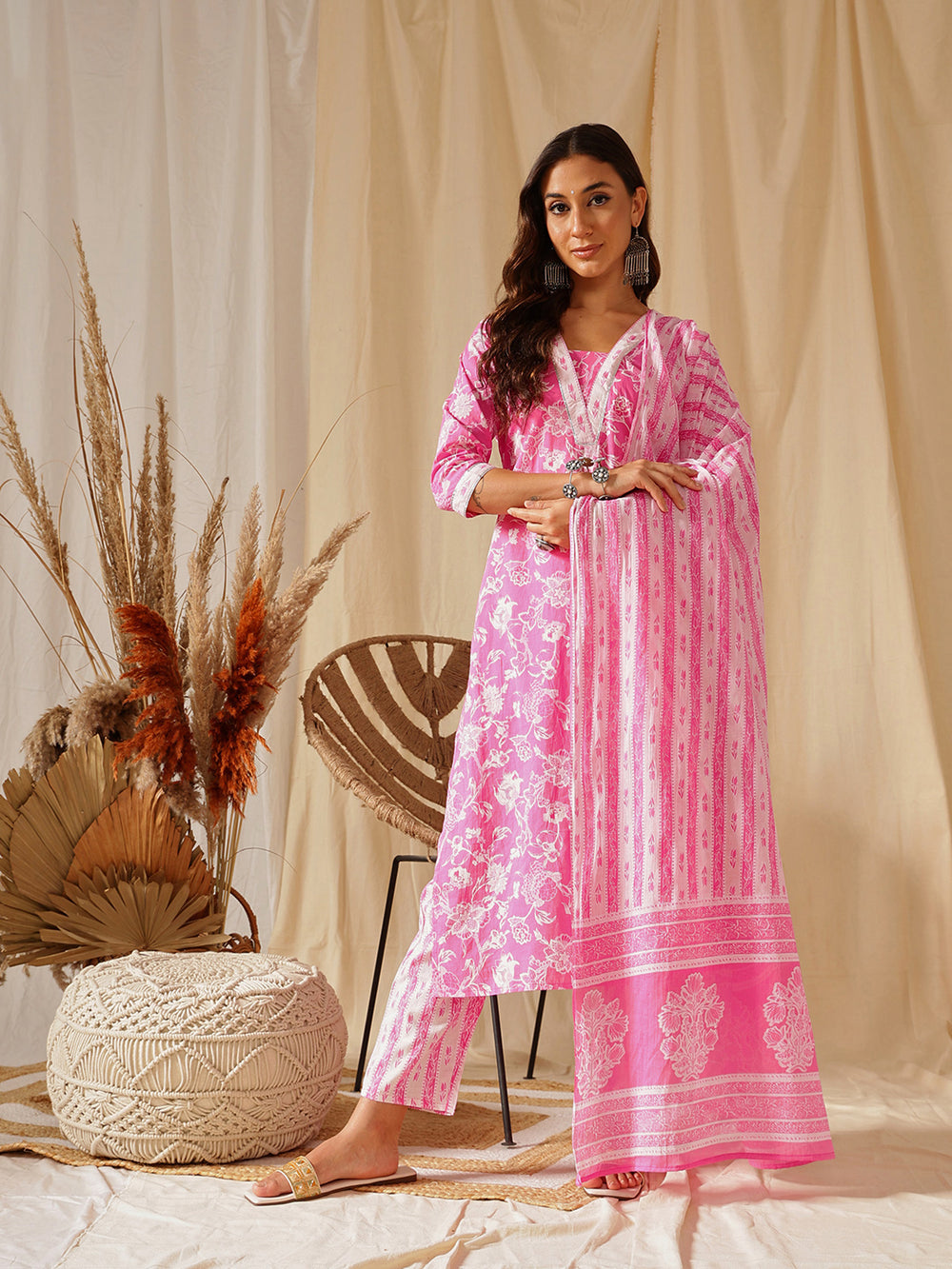 The ensemble is completed with a Dupatta that matches the Kurta and Trousers. It carries the same floral print and adds an extra layer of elegance to the outfit.