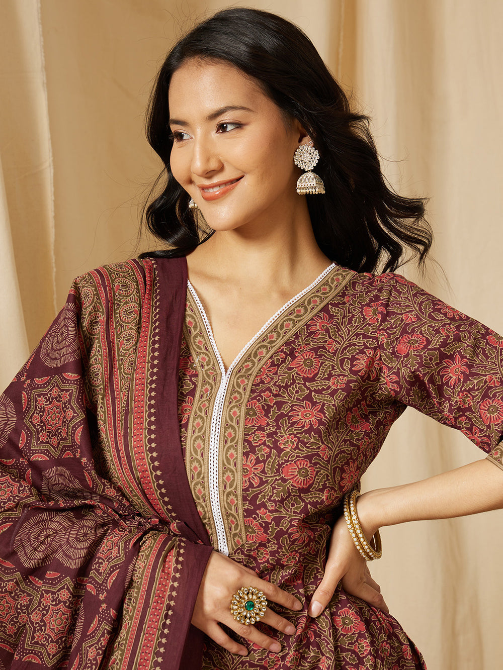 "The kurta features intricate floral patterns in shades of pink and green on a dark purple background. It has three-quarter sleeves, a V-neckline adorned with delicate lace borders, and reaches down to the knees.